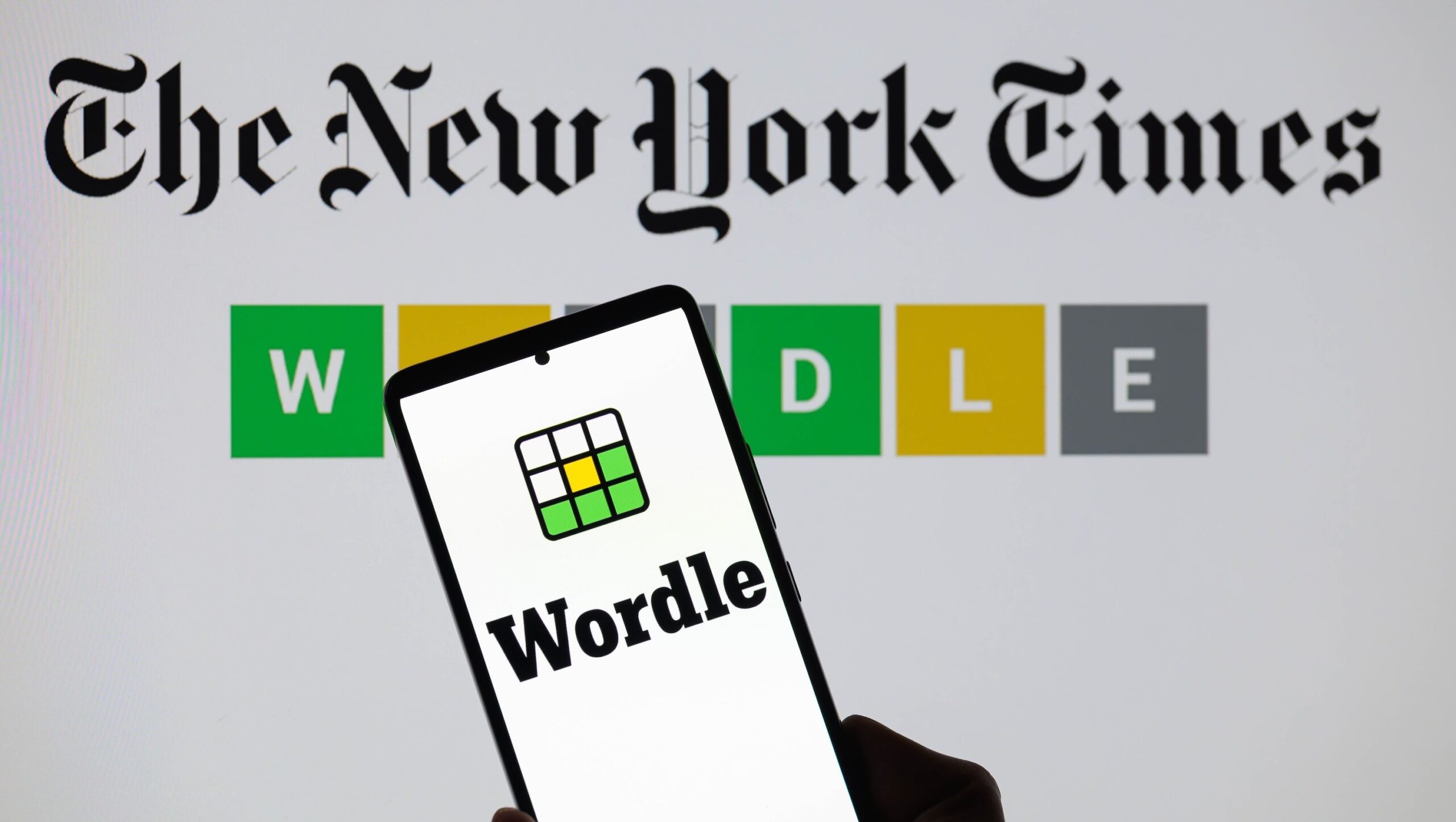 The Wordle logo is being displayed on a smartphone with The New York Times visible in the background in this photo illustration in Brussels, Belgium, on June 1, 2024. (Photo by Jonathan Raa/NurPhoto)