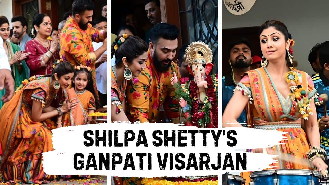 Shilpa Shetty celebrated Ganpati Visarjan with her family, joyfully bidding farewell to Lord Ganesha while promoting eco-friendly practices with a clay idol and lively festivities.