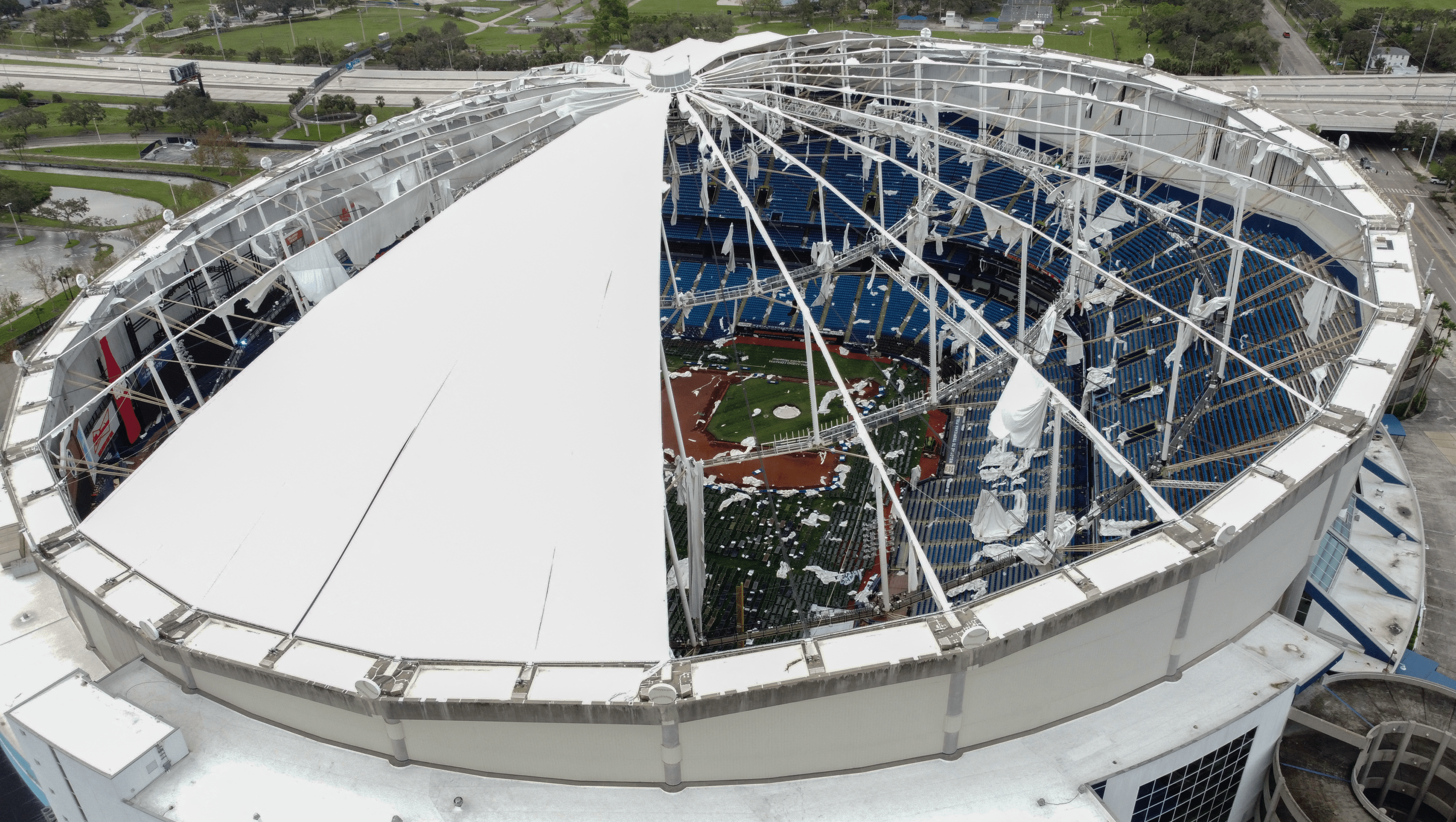 Here’s some drone video we shot giving you a look at the extensive damage to the roof and the inside of Tropicana Field, the home of @RaysBaseball. pic.twitter.com/WLL1uD8PHh