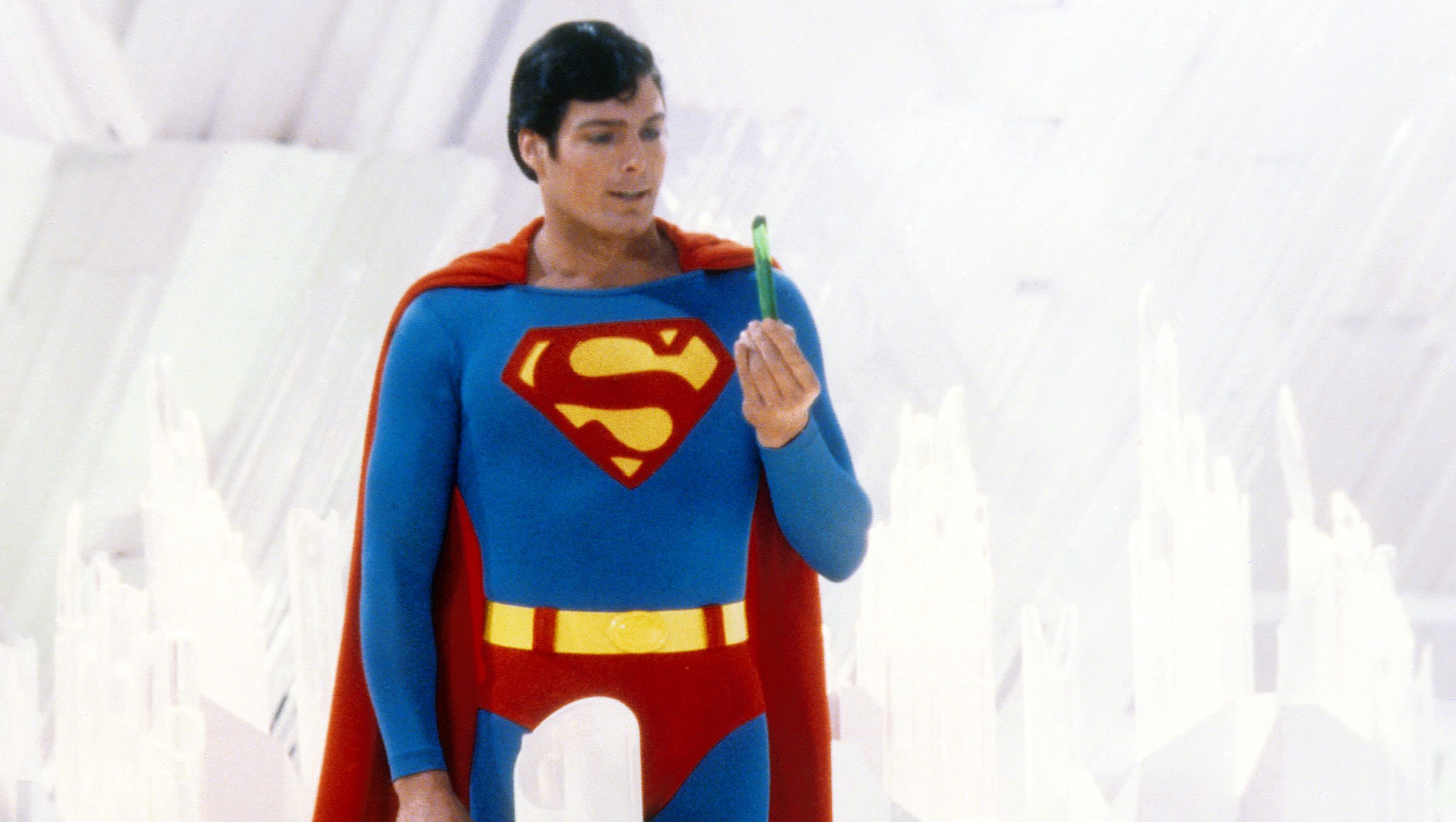 Superman, played by American actor Christopher Reeve (1952 - 2004), holds a green crystal at the Fortress of Solitude, in a promotional still from 'Superman', directed by Richard Donner, 1978. (Photo by Silver Screen Collection/Getty Images)