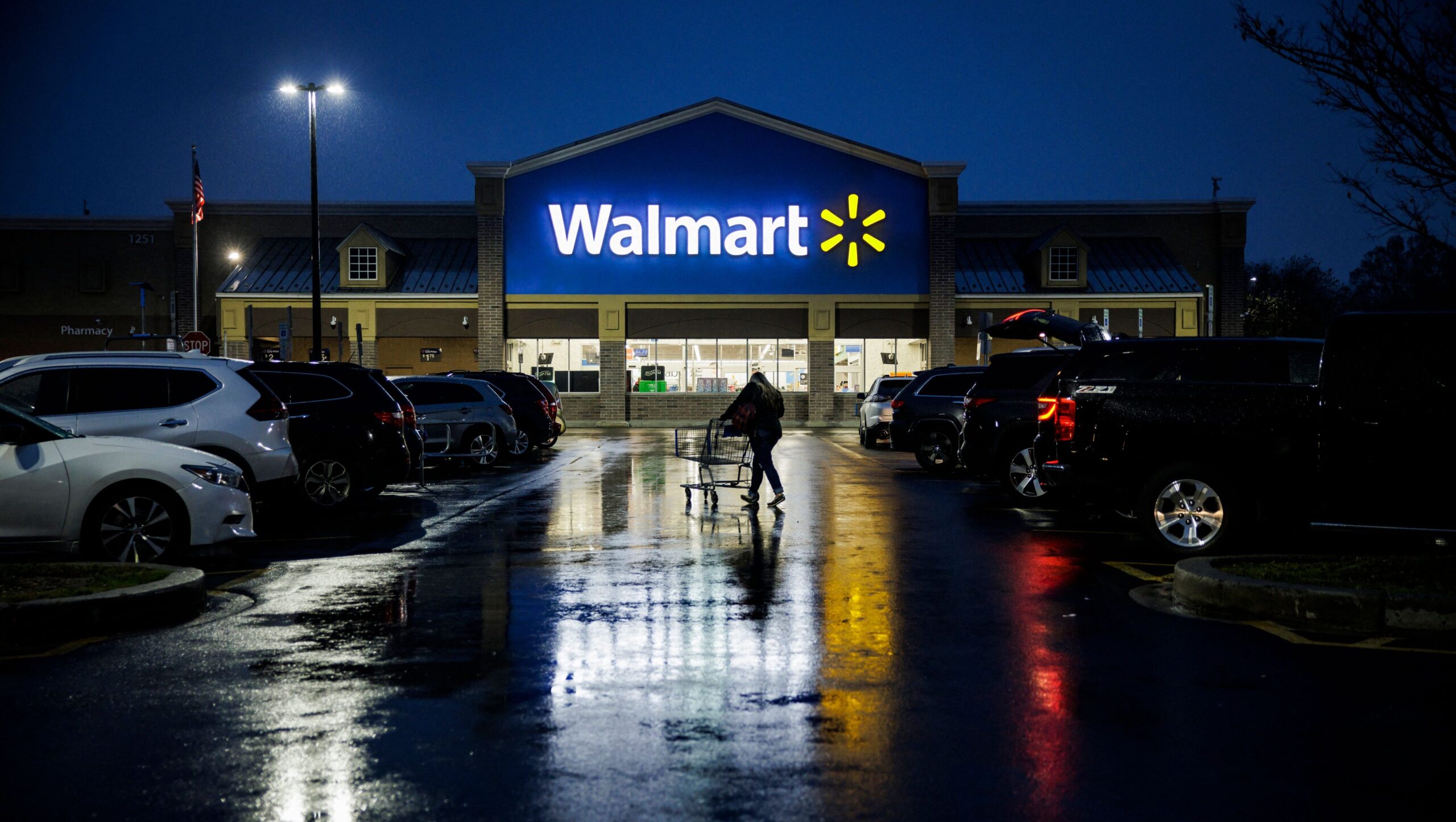 A shopper pushes a cart through the parking lot of a Walmart on the morning of Black Friday in Wilmington, Delaware, on November 25, 2022. - With inflation on the rise, retailers are expecting that many shoppers will be looking for especially good deals as discretionary spending falls. (Photo by Samuel Corum / AFP) (Photo by SAMUEL CORUM/AFP via Getty Images)